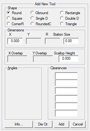 Specify the appropriate dimensions for the tool. For example, Round and Square tools only require an X dimension, while Obrounds, Single D, Double D and Rectangle tools require X and Y dimensions. You must Also specify an R (Radius) for Corner Radius and Rounded Corner tools. For a Triangle, you must specify X, Y and C dimensions. In addition, you must type a value in the Station Size text box. |