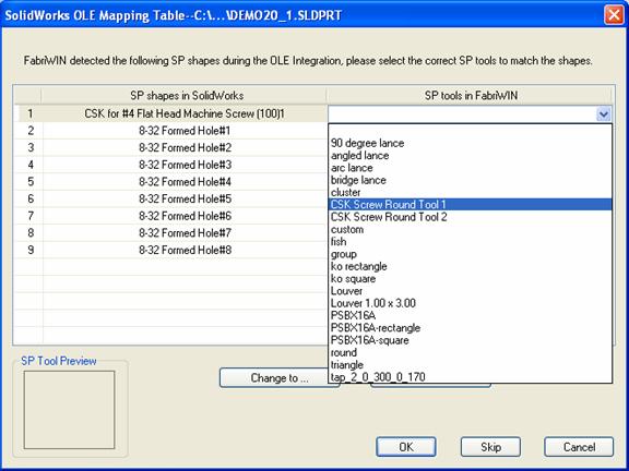 When using the command Open&OLE or OLE Integration, the system provides a method to enable the user to map the forming shape of SolidWorks® with the SP tools in AP100US. When a Form Shape is detected on the Face of the 3D model, then the item will come over to a Group within AP100US, which can easily be assigned a tool.