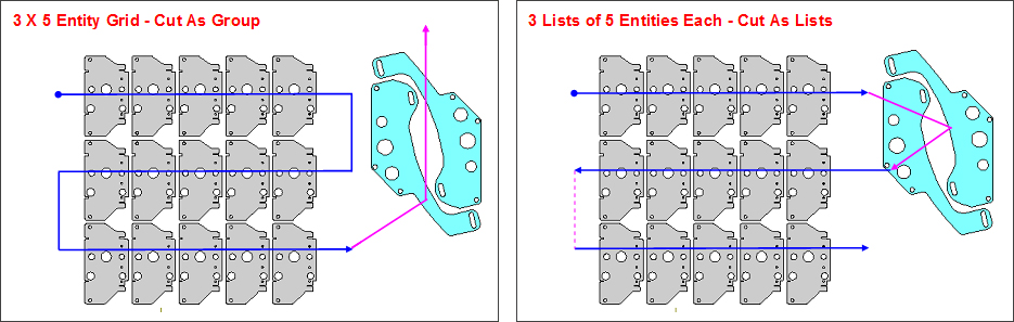 Cut entire grid of entities as a rectangular group, rather than as multiple lists: A group of parts with the same geometry can be packed (or grouped) to be cut as a single entity. The image at left shows the cutting result with this option checked ON. The smaller gray parts are cut first, then the larger aqua parts are cut.