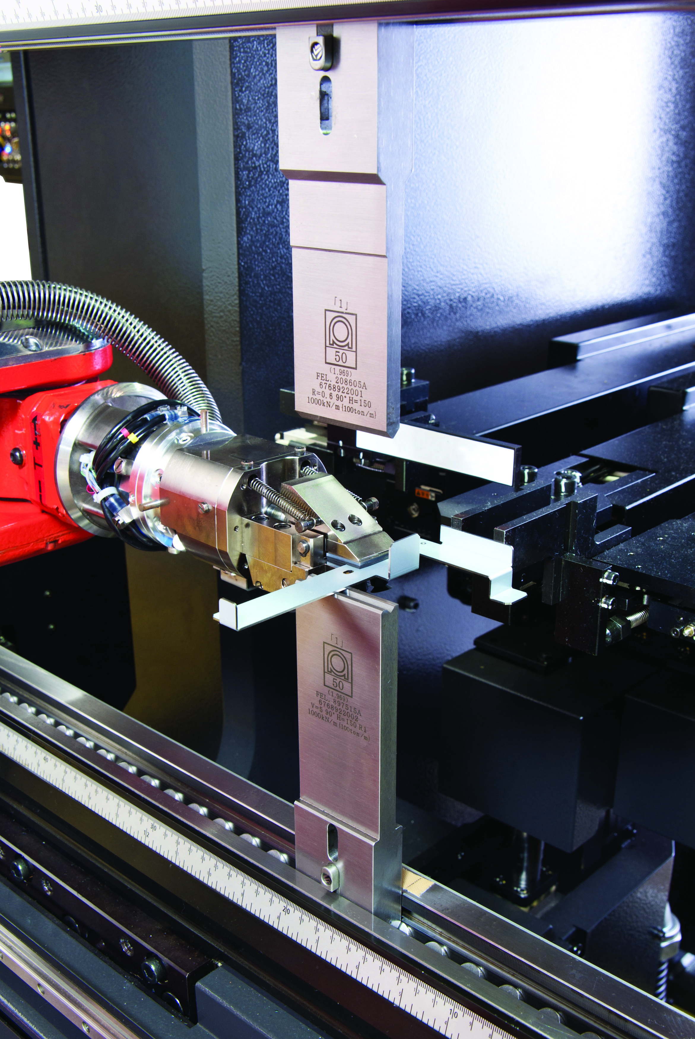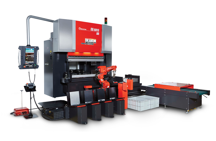 The EG 6013 AR bending cell (a servo-electric press brake) uses the world's first dual servo-electric drive – allowing for high speed and high precision. Combined with a bending robot, the EG AR bends small parts, eliminating the need for human operation and reducing the risk of danger when dealing with small, difficult-to-handle parts.