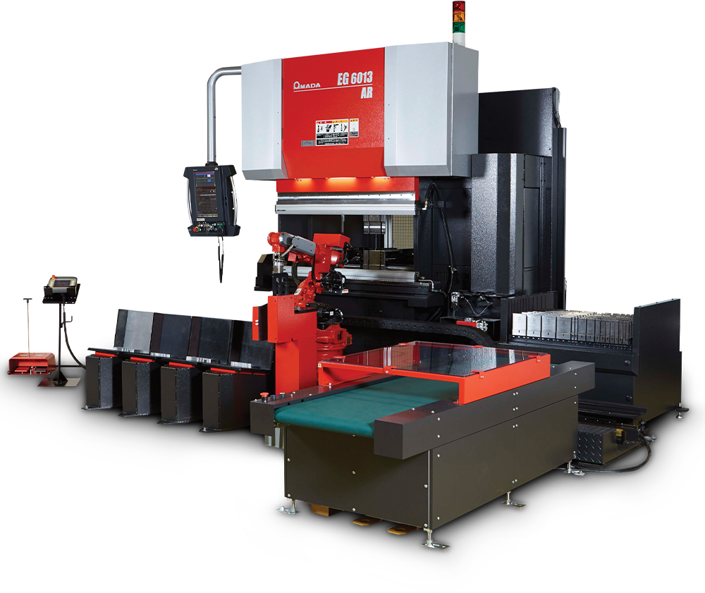The EG 6013 AR bending cell (a servo-electric press brake) uses the world's first dual servo-electric drive – allowing for high speed and high precision. Combined with a bending robot, the EG AR bends small parts, eliminating the need for human operation and reducing the risk of danger when dealing with small, difficult-to-handle parts.